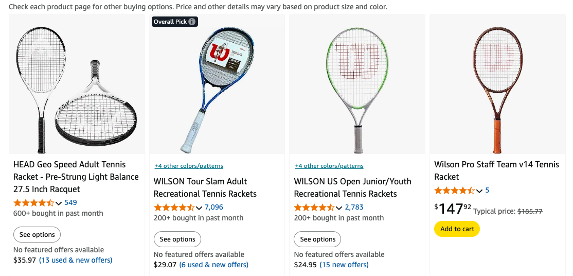 Amazon — крупнейшая торговая площадка, где представлен огромный выбор теннисных и бадминтонных ракеток от ведущих брендов. Здесь удобно сравнивать цены, читать отзывы и выбирать подходящую модель. Amazon доставляет в более чем 100 стран мира, а ассортимент постоянно обновляется.