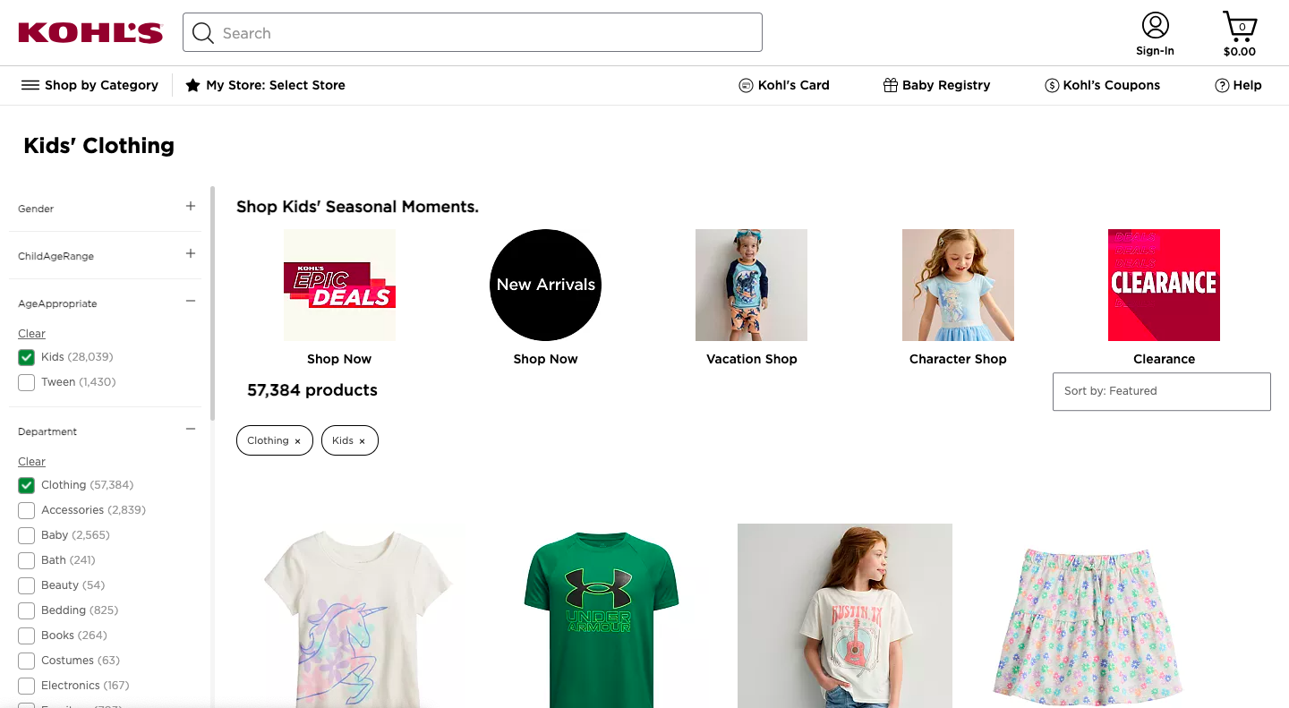 Kohl’s — второй по величине универсальный магазин в США, который предлагает большой выбор детской одежды и обуви. Здесь представлены популярные бренды, а также собственные линии одежды. В Kohl’s регулярно проходят акции, действует система бонусов и “Kohl’s Cash”, что делает покупки еще выгоднее.
