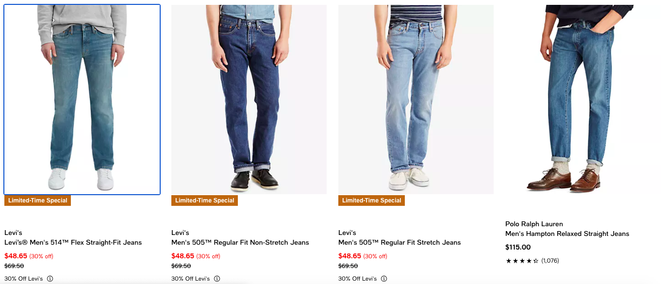 Macy’s — крупный американский ритейлер с большим выбором джинсов Levi’s, Calvin Klein, Tommy Hilfiger и других. Средняя цена — около $40-50, часто проходят распродажи.