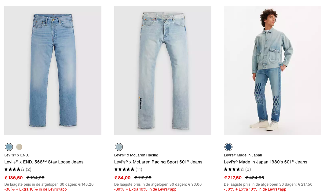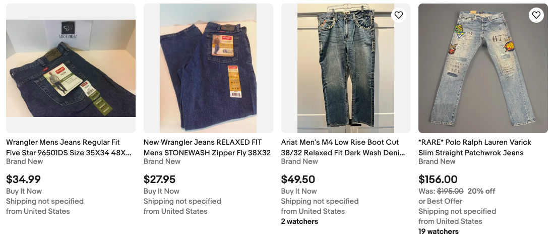 eBay — отличный вариант для тех, кто ищет редкие модели или хочет купить джинсы по сниженной цене. На аукционах можно найти как новые, так и винтажные джинсы от известных брендов.
