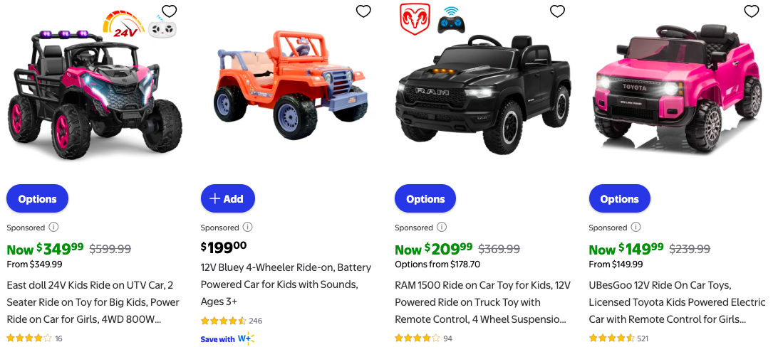 Walmart – крупнейшая сеть супермаркетов США, где представлен большой выбор беговелов и электромобилей для детей. Магазин предлагает бюджетные и премиальные модели, включая популярные бренды и новинки. Walmart славится выгодными ценами, регулярными скидками и удобной системой доставки. Здесь можно подобрать транспорт для малышей и детей постарше с учетом всех потребностей.