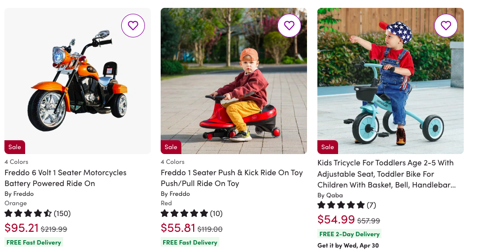 Wayfair – крупный онлайн-ритейлер мебели и товаров для дома, где также можно найти детский транспорт, включая беговелы и электромобили. Магазин предлагает разнообразие моделей с разным дизайном и функционалом, а также удобные условия доставки по США. Wayfair регулярно проводит распродажи и акции, что позволяет приобрести качественный детский транспорт по выгодной цене.