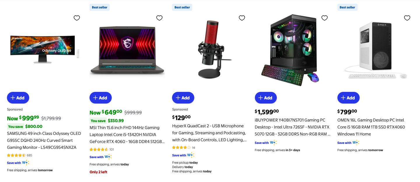 Walmart — универсальный ритейлер с огромным выбором электроники для геймеров: игровые консоли, ноутбуки, аксессуары, гарнитуры, микрофоны, кресла, веб-камеры, карты захвата и многое другое. Walmart славится демократичными ценами, регулярными акциями и возможностью самовывоза. Магазин подходит для тех, кто ищет выгодные предложения на популярные устройства и аксессуары.
