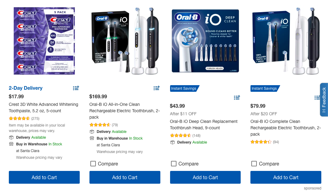 Costco — сеть магазинов оптовой торговли, где можно купить зубные пасты и щётки оптом по выгодным ценам. В ассортименте — наборы паст Crest, Colgate, а также электрические щётки Oral-B. Costco предлагает качественные товары с гарантией и удобной доставкой.
