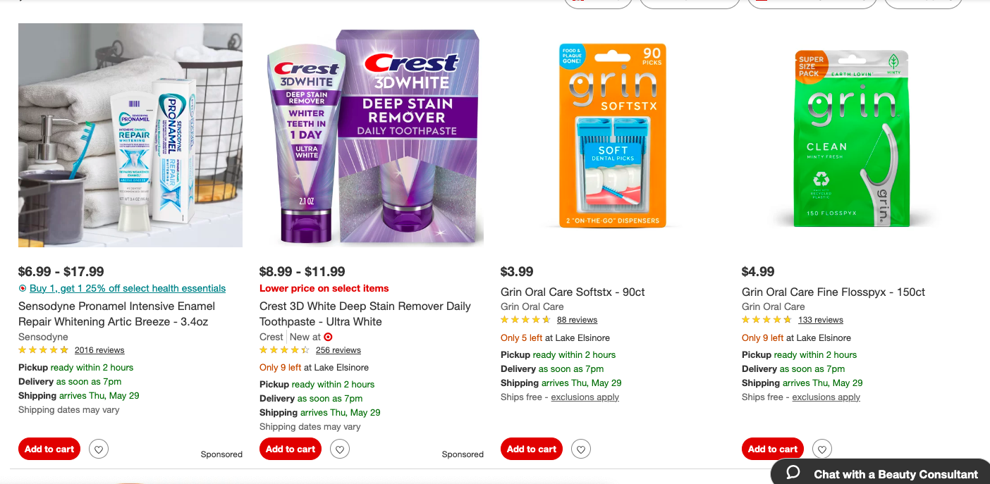 Target — популярная сеть магазинов с качественным ассортиментом средств гигиены полости рта. В разделе зубных паст и щёток представлены товары от Crest, Colgate, Tom’s of Maine и других брендов. Target регулярно проводит распродажи и предлагает программы лояльности, что позволяет покупать качественные товары по выгодным ценам.