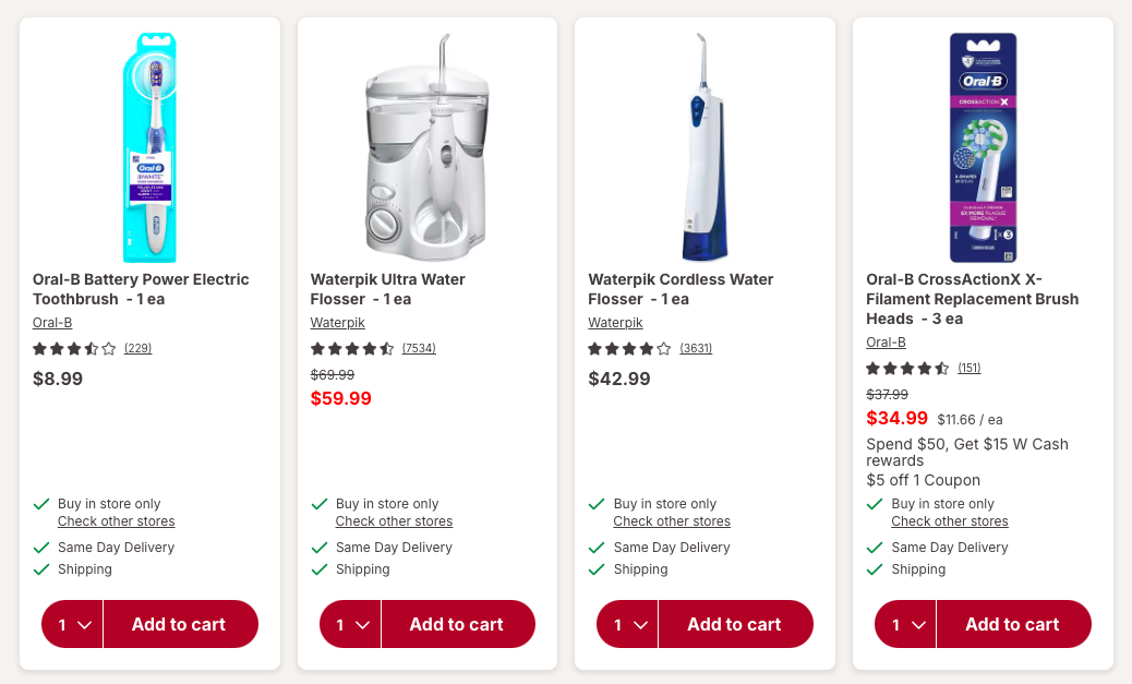 Walgreens — одна из крупнейших аптечных сетей США с широким выбором зубных паст, щёток и ирригаторов, включая профессиональные и лечебные серии. Здесь можно найти пасты с фтором, без SLS, отбеливающие и для чувствительных зубов, а также электрические щётки Oral-B и Philips Sonicare.