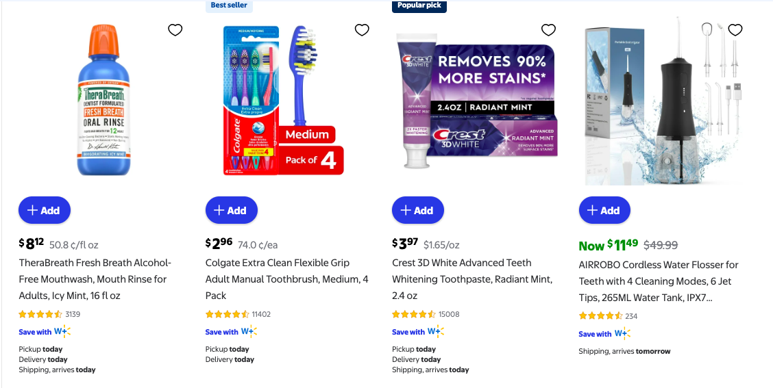 Walmart — крупнейшая сеть супермаркетов США с огромным выбором зубных паст и щёток от ведущих брендов: Crest, Colgate, Oral-B, Sensodyne и других. Здесь представлены классические и инновационные средства с отбеливающим эффектом, защитой от кариеса и чувствительности. Walmart славится выгодными ценами, регулярными акциями и быстрой доставкой по всей территории США.