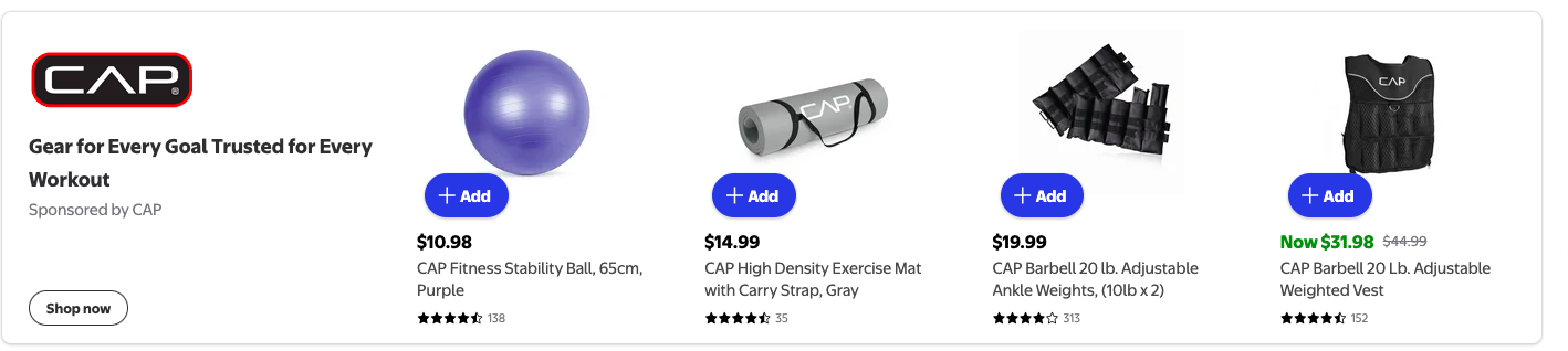 Walmart — универсальный магазин с большим выбором тренажёров и спортивных ковриков по доступным ценам. Здесь представлены модели для начинающих и продвинутых спортсменов, а также аксессуары для домашнего фитнеса. Walmart предлагает удобный интерфейс, частые акции и быструю доставку по США.