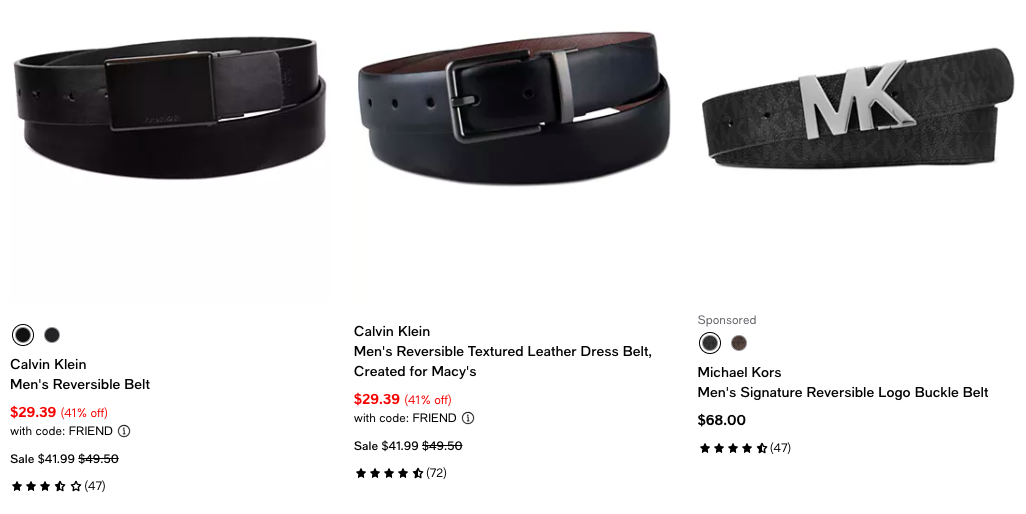 Macy’s — легендарный американский универмаг с большим выбором мужских ремней по доступным ценам. Здесь можно найти ремни из натуральной кожи и текстиля от Tommy Hilfiger, Levi’s, Calvin Klein и других популярных брендов. Macy’s регулярно проводит распродажи и предлагает купоны на скидку, что позволяет выгодно обновить гардероб.