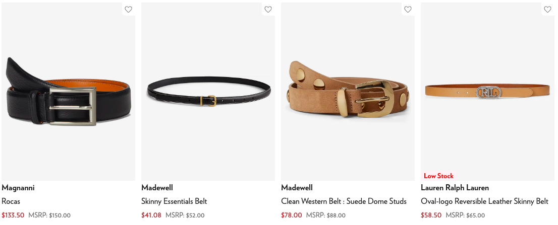 Nordstrom — один из самых престижных универмагов США, где представлен широкий ассортимент ремней премиум-класса. В каталоге — классические кожаные ремни, стильные текстильные модели и дизайнерские решения от Tommy Hilfiger, Levi’s и других брендов. Nordstrom славится высоким уровнем сервиса, бесплатной доставкой по США и удобной системой возврата. Это отличный выбор для тех, кто ценит качество и стиль.