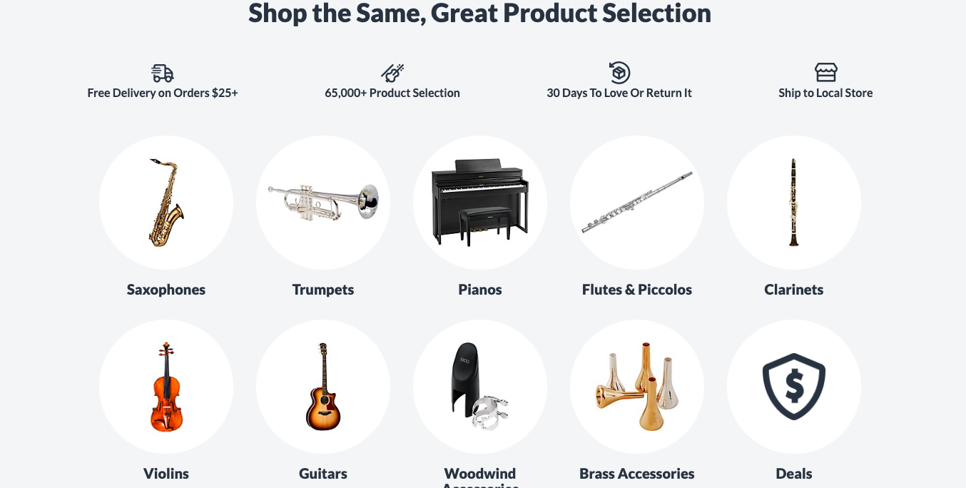 Woodwind & Brasswind — специализированный магазин духовых и оркестровых инструментов. Здесь представлен широкий выбор кларнетов, саксофонов, труб, тромбонов, флейт и аксессуаров для начинающих и студентов. Магазин известен гибкой политикой возврата, возможностью аренды и отличной репутацией среди школ и музыкальных преподавателей.