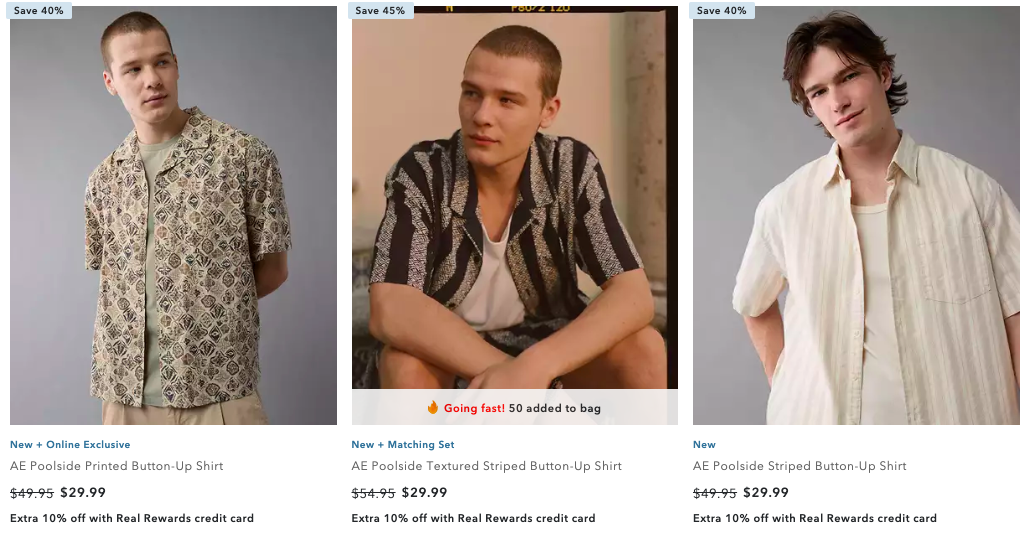 American Eagle Outfitters — отличный вариант для молодых и активных мужчин, предпочитающих комфорт и стиль. В ассортименте — повседневные и casual-рубашки, которые легко сочетать с джинсами или шортами. American Eagle известен демократичными ценами, частыми акциями и широким размерным рядом.