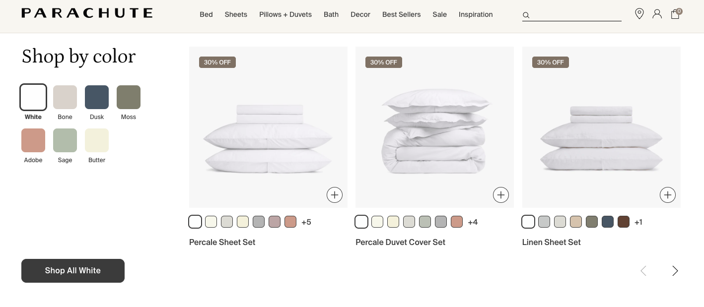Parachute — бренд, который специализируется на стильном и качественном текстиле для спальни: постельное белье, подушки, одеяла, пледы, матрасы и даже домашняя одежда. Вся продукция производится из премиальных материалов, включая европейский лен и органический хлопок. Parachute отличается современным дизайном, разнообразием оттенков и возможностью собрать индивидуальный комплект для любого интерьера. Магазин также предлагает подушки и матрасы собственного производства.