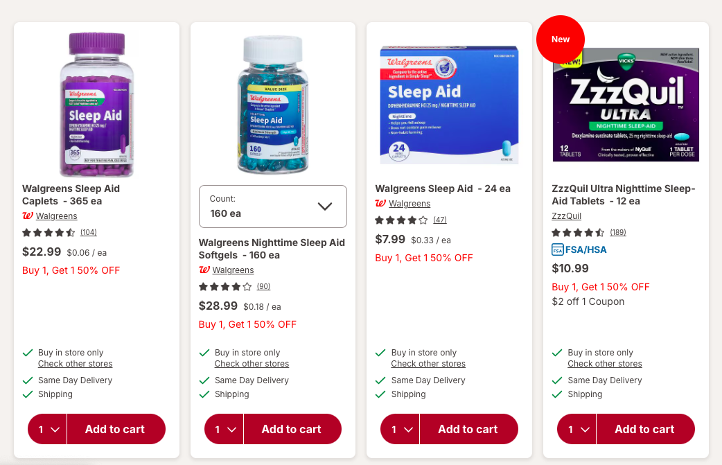 Walgreens — крупнейшая аптечная сеть США, где можно купить широкий ассортимент средств для сна: мелатонин, растительные препараты, капсулы, таблетки, жевательные пастилки, а также аксессуары для сна (маски, беруши и др.). Walgreens предлагает как брендовые, так и собственные продукты, регулярно проводит акции и обеспечивает быструю доставку. Магазин подходит для тех, кто ищет эффективные и доступные решения для улучшения сна.