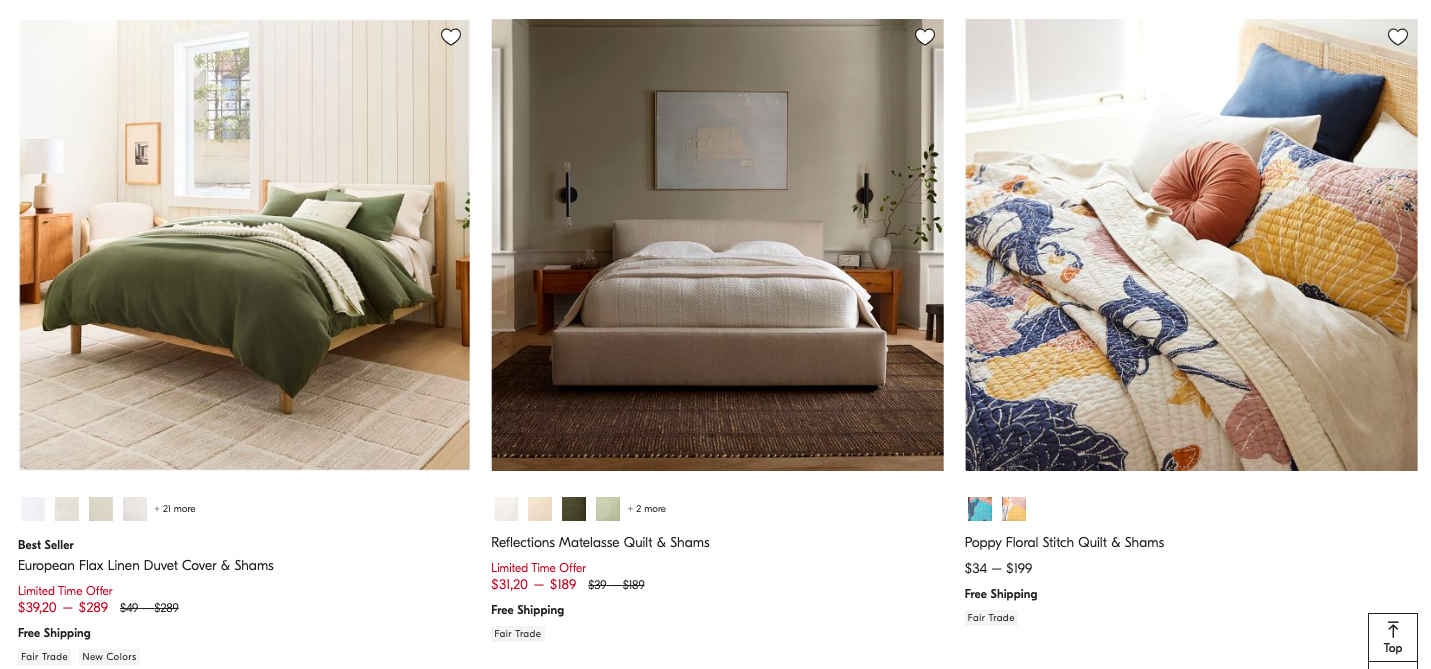 West Elm — магазин для ценителей современного дизайна и комфорта. В каталоге: стильное постельное белье, покрывала, подушки, матрасы, одеяла, а также мебель для спальни. Продукция West Elm изготавливается из высококачественных тканей (хлопок, лен, фланель, Tencel), а дизайн сочетает минимализм и уют. Магазин предлагает бесплатные консультации по оформлению интерьера и быструю доставку.
