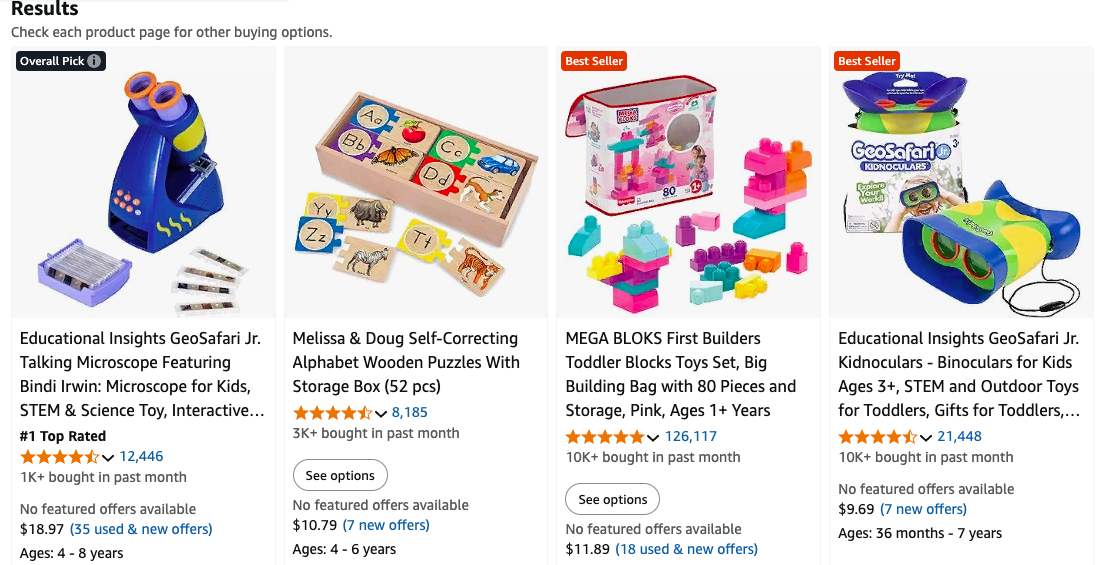 Amazon — крупнейшая торговая площадка США с огромным выбором развивающих игрушек и игр для детей всех возрастов. Здесь представлены товары от ведущих брендов, включая LEGO, Fisher-Price, Melissa & Doug, VTech и многие другие. Удобный поиск, отзывы покупателей и частые акции делают Amazon отличным местом для выгодных покупок. Для доставки в Россию удобно использовать сервис LiteMF.