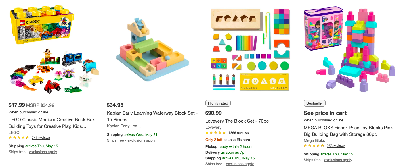 Target — популярный американский магазин с большим ассортиментом детских товаров, включая развивающие игры и игрушки. Здесь можно подобрать товары для малышей, дошкольников и школьников, а также найти эксклюзивные коллекции и новинки. Target предлагает удобный интерфейс, частые скидки и бесплатную доставку при заказе от определённой суммы.