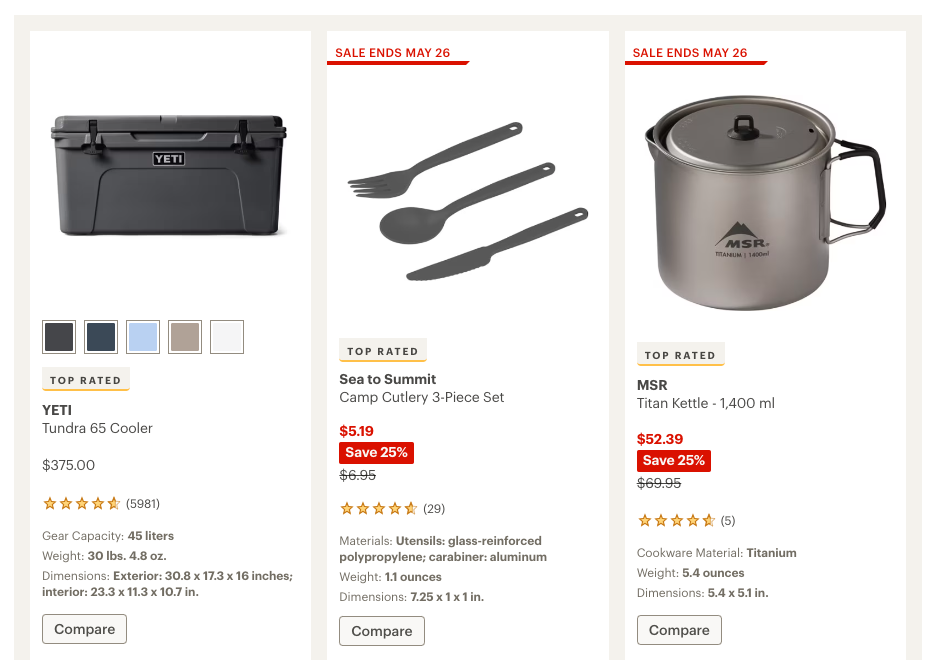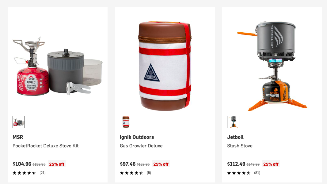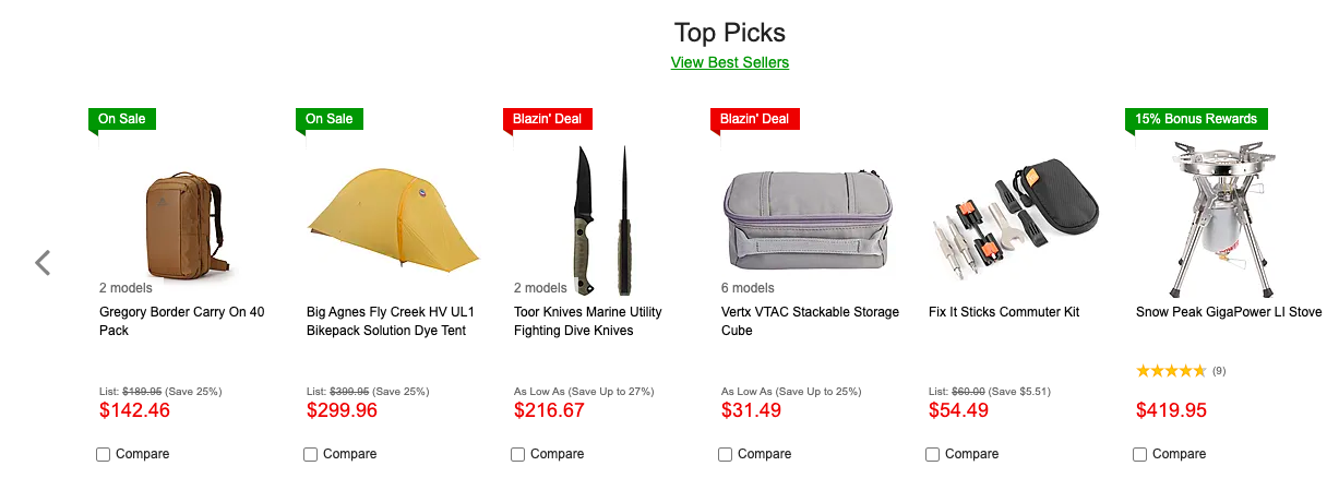 REI — один из самых известных и уважаемых магазинов США для любителей активного отдыха. Здесь представлен огромный выбор палаток, спальных мешков, рюкзаков, мебели для кемпинга, посуды, горелок, фонарей, одежды и обуви для любого сезона. REI сотрудничает с ведущими брендами, регулярно проводит акции и распродажи, а также предлагает собственную линию качественного снаряжения. Магазин славится экспертной поддержкой, подробными описаниями товаров и возможностью подобрать снаряжение для любого уровня подготовки — от новичка до профессионала.