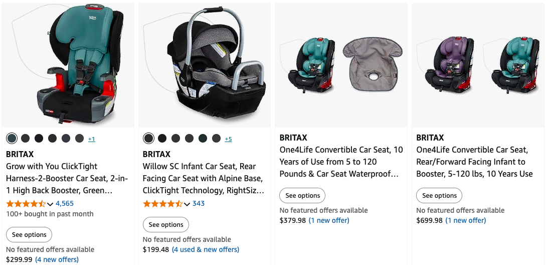 Amazon — крупнейшая онлайн-платформа, где представлен максимальный ассортимент автокресел Britax, Chicco, Evenflo и других мировых брендов. На Amazon легко сравнить цены, прочитать отзывы тысяч покупателей и выбрать нужную комплектацию. Преимущества — быстрая обработка заказов, регулярные скидки, акции и возможность отслеживать статус посылки на каждом этапе. Благодаря большому количеству продавцов вы всегда найдете нужную модель по лучшей цене. Amazon — идеальный выбор для тех, кто ценит удобство и скорость покупки.