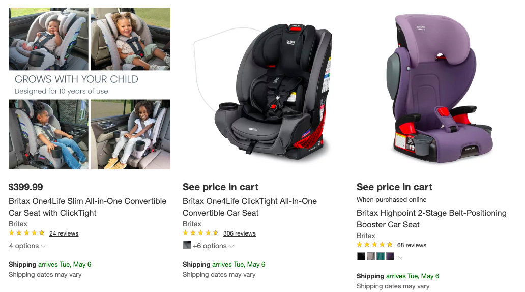 Target — один из крупнейших американских ритейлеров, где представлен широкий выбор автокресел Britax, Chicco, Evenflo и других топовых брендов. Здесь можно найти все типы автокресел: от универсальных трансформеров до бустеров и моделей для новорожденных. Target предлагает удобную навигацию, подробные фильтры по возрасту, весу и типу крепления, а также частые акции и скидки. Магазин гарантирует оригинальность продукции, быструю обработку заказов и отличную упаковку для международной доставки. Покупая в Target, вы получаете доступ к последним коллекциям и эксклюзивным моделям.