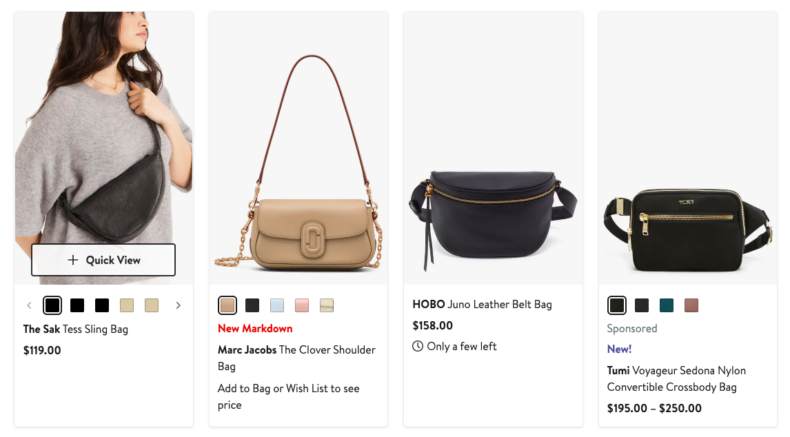Nordstrom — один из самых популярных универмагов США, где собраны сумки от ведущих мировых брендов: Gucci, Saint Laurent, Valentino и многих других. Магазин предлагает огромный выбор сумок-тоутов, клатчей и рюкзаков для любого случая. Удобная навигация по сайту, фильтры по бренду, цене и цвету, а также эксклюзивные коллаборации делают Nordstrom идеальным местом для модных покупок. Регулярные акции и быстрая доставка по США — дополнительные плюсы.