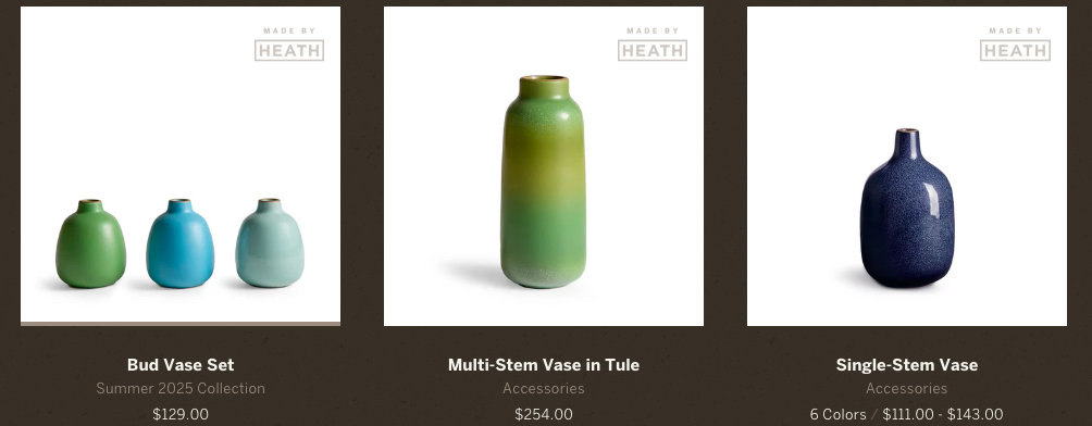 Heath Ceramics — легендарный калифорнийский бренд, известный своим минималистичным и современным дизайном. Компания с 1948 года производит керамическую посуду ручной работы: тарелки, блюда, чаши, сервизы и аксессуары для сервировки. Все изделия создаются с заботой о природе — Heath Ceramics использует экологичные материалы и поддерживает устойчивое производство. Посуду отличает приятная тактильность, глубокие цвета и разнообразие форм. Heath Ceramics идеально подойдёт для тех, кто ищет стильную и долговечную посуду для дома или подарка.