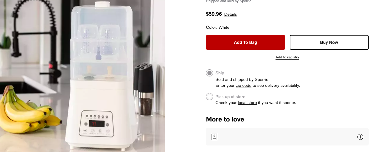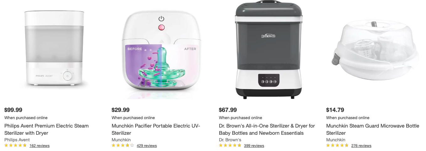 Target — один из крупнейших ритейлеров США, где представлен огромный выбор товаров для новорожденных: бутылочки, стерилизаторы, молокоотсосы, аксессуары для кормления и ухода. В ассортименте — ведущие бренды, такие как Dr. Brown’s, Philips Avent, Baby Brezza, Medela, Tommee Tippee и другие. На сайте легко сравнить модели по цене, рейтингу и функциям: например, электрические и микроволновые стерилизаторы, многоразовые бутылочки, ручные и электрические молокоотсосы. Target славится регулярными акциями и быстрой доставкой по США, что делает его идеальным выбором для родителей, которые ценят удобство и широкий ассортимент.