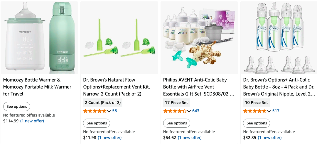 Amazon — крупнейшая онлайн-платформа с максимальным выбором товаров для новорожденных. Здесь вы найдете бутылочки, стерилизаторы, молокоотсосы, паровые мешки для стерилизации, аксессуары для хранения молока и многое другое. На Amazon представлены все ведущие бренды, включая Philips Avent, Medela, Dr. Brown’s, Tommee Tippee и Baby Brezza. Преимущество Amazon — возможность читать тысячи отзывов родителей, сравнивать цены, выбирать комплекты и получать товары по выгодным ценам с быстрой доставкой по США.