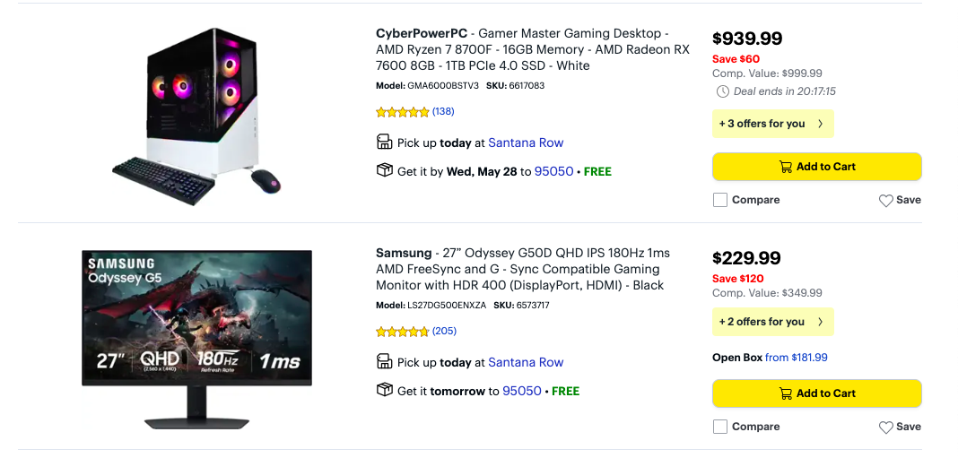Best Buy — крупная сеть электроники и техники, где можно купить все основные комплектующие и аксессуары для ПК: видеокарты, процессоры, SSD, мониторы, клавиатуры, мыши, гарнитуры и многое другое. Магазин предлагает быструю доставку, возможность самовывоза, программу price-match и отличную поддержку клиентов. В Best Buy часто проходят акции и распродажи, а возврат товара максимально удобен.