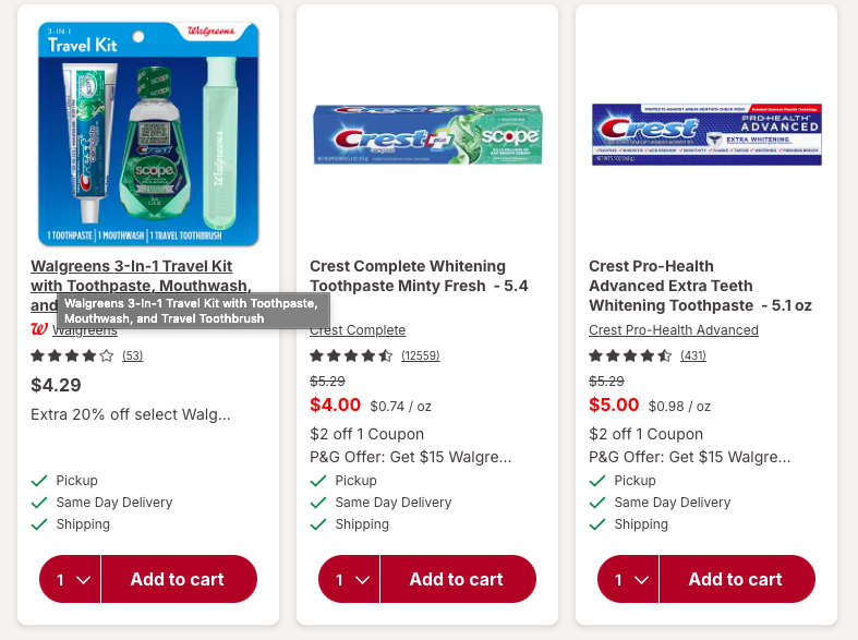 Walgreens — одна из крупнейших аптечных сетей США, где представлен широкий выбор зубных паст и щёток, включая профессиональные и лечебные серии. Здесь можно найти пасты с фтором, без SLS, отбеливающие и для чувствительных зубов, а также электрические щётки Oral-B и Philips Sonicare.